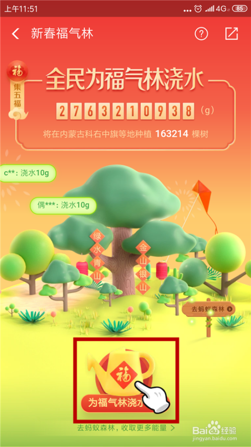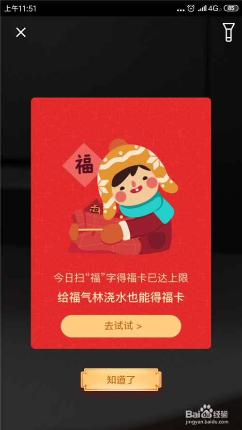 当扫描达到上限后即不成在继续扫福,这时辰会提醒可以给福分林浇水,点击【去尝尝】。