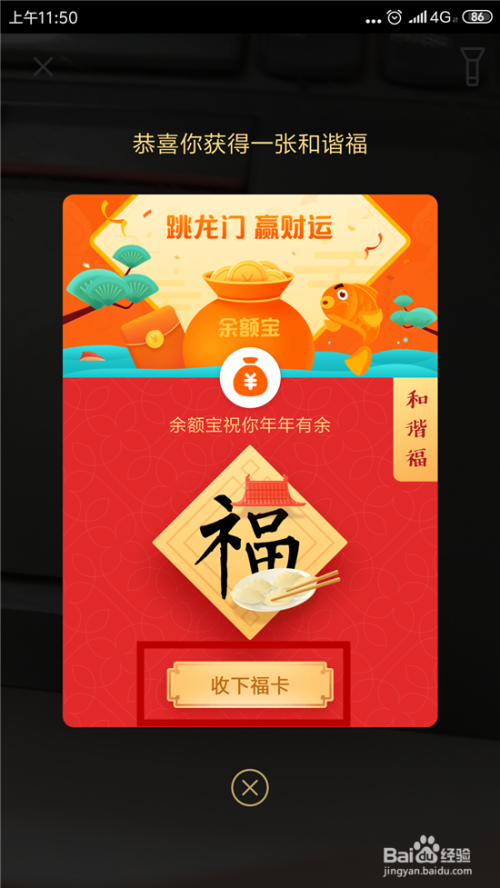 当作功扫描到福字后就可以随机获得五福中的肆意福字,小编这里获得的是【协调福】,点击【收下福卡】。