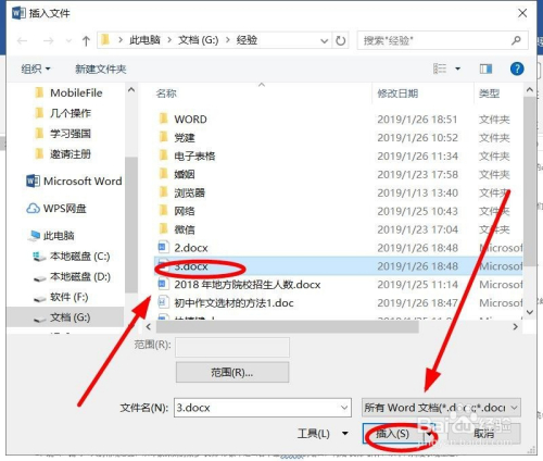 在弹出窗口,选中要插入内容的文件后,单击“插入”