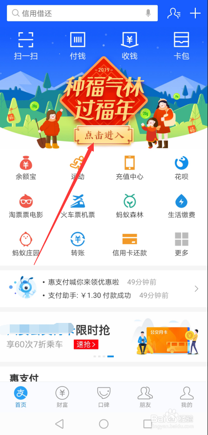 打开付出宝后在首界面里就可以看到五福卡活动进入按钮,直接点击进入,如下图所示。