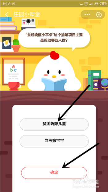 在答题上方可看到问题是【益起叫醒小耳朵这个捐赠项目本家儿如果帮忙哪些人群】,谜底选择第一个,然后点击【确定】。