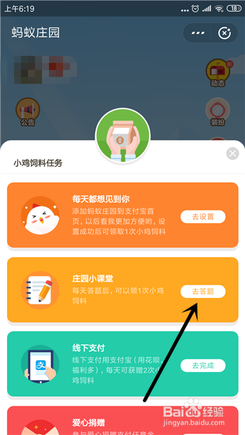 准确回覆问题后点击【去领取】返回领饲料使命。