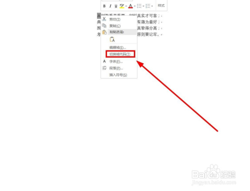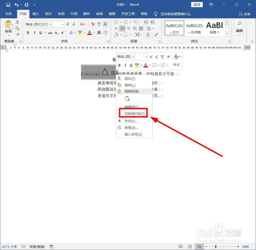 选中加三角的文字之后,鼠标右键,选择“切换域代码”单击