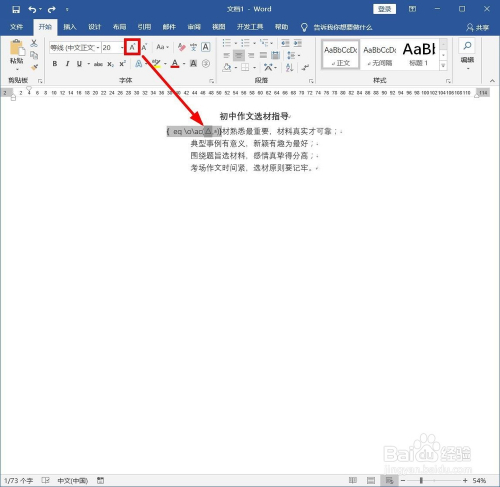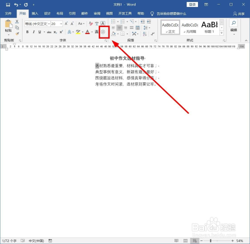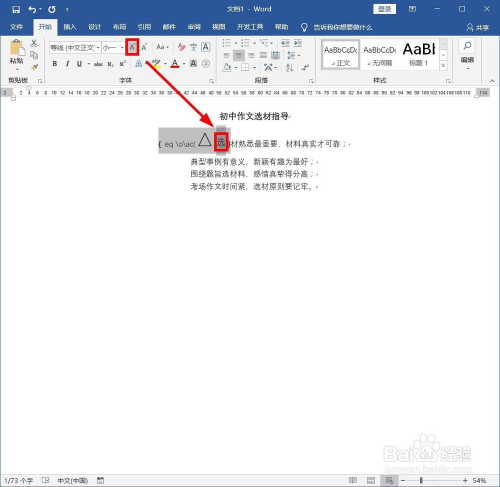 选中此中一个字符,好比“选材”的“选”,找到菜单栏中的“起头”选项卡单击