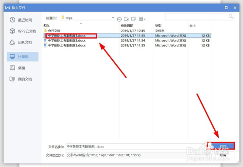 在弹出窗口,选中要插入内容的文件后,单击“打开”