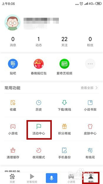 首先打开百度浏览器后点击【我的】,然后找到【活动中间】并点击。