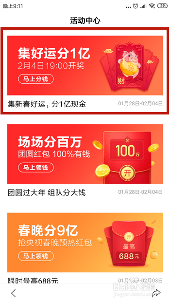 然后在活动中即可看到集好运分1亿的活动,点击打开活动。