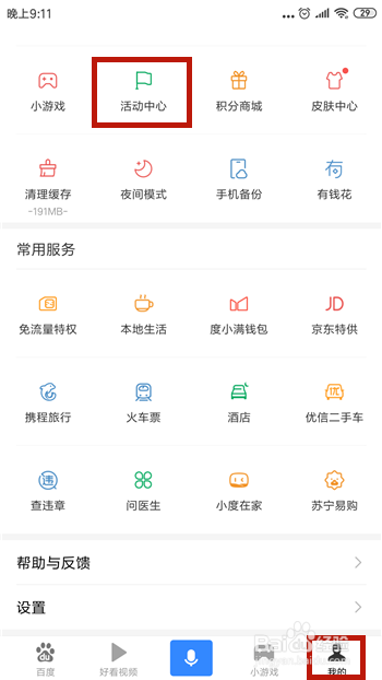 在百度的小我中间里点击【活动中间】选项打开活动界面。