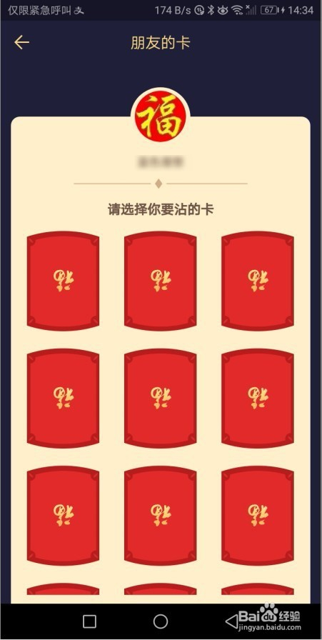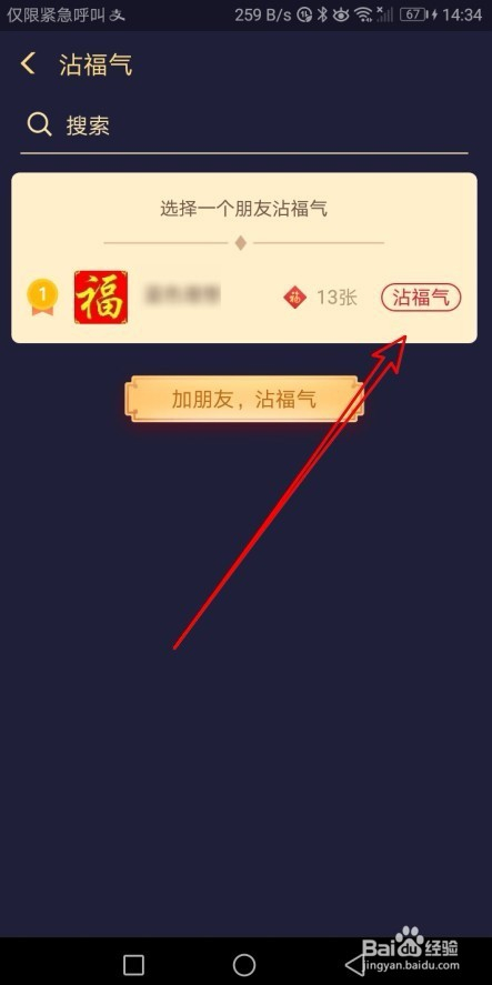 在打开的沾福分的页面中,我们选择一个要沾福分的老友,点击该老友后面的“沾福分”的按钮。