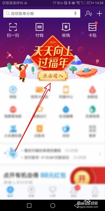 首先我们在手机上打开付出宝,然后点击付出宝本家儿界面上的“点进进入”按钮