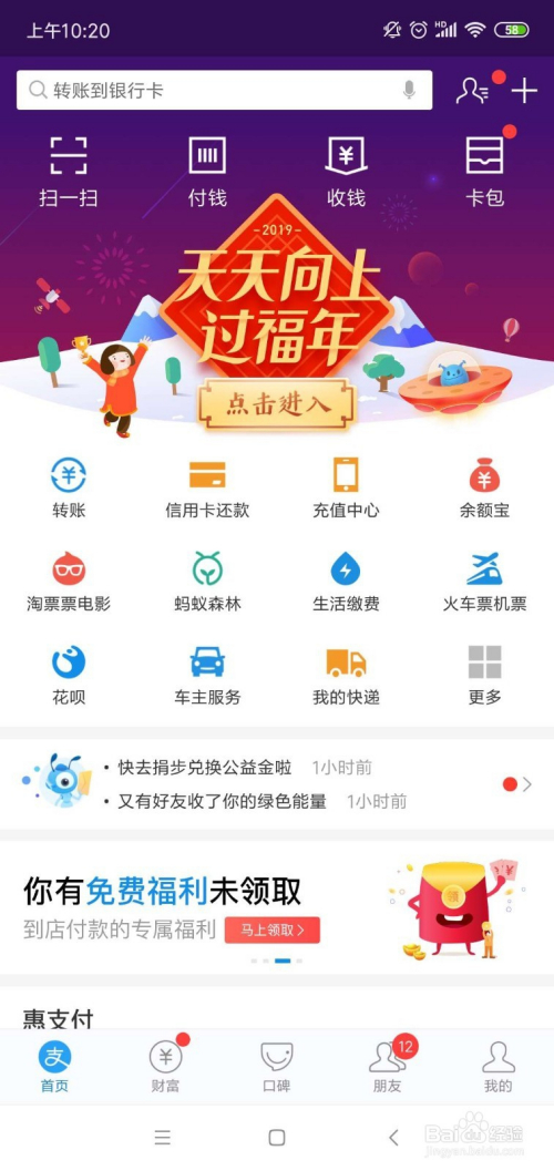 首先打开付出宝首页,进入过福年;