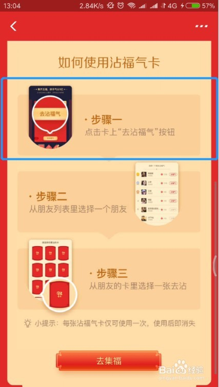 首先要先获得沾福分卡,沾福分卡可以经由过程集福卡时获得,还有就是每日初次到店付出可以获得沾福分卡。