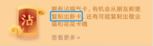 按照沾福分卡的申明,利用沾福分卡有机遇从老友那边复制一张新卡。若是我的理解没错的话,若是只缺花花卡,用沾福分卡去老友那边沾福,若是获得福卡,就必然会是花花卡。至于我的理解是否准确,就等列位伴侣去验证了。祝大师早日集得五福还有花花卡,开高兴心过个福年。