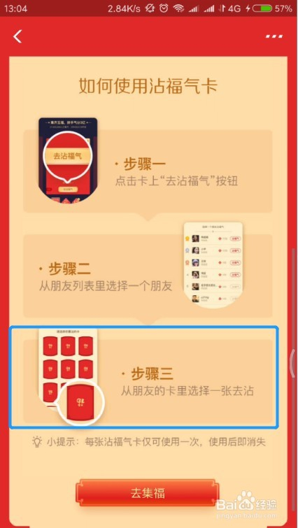 因为我还没获得沾福分卡,就用官方给出的攻略介绍一下付出宝沾福分卡要怎么利用吧。按照攻略,在获得沾福分卡后,要先点击获得的沾福分卡,然后沾福分卡上面会显示去沾福分,点击去沾福分。