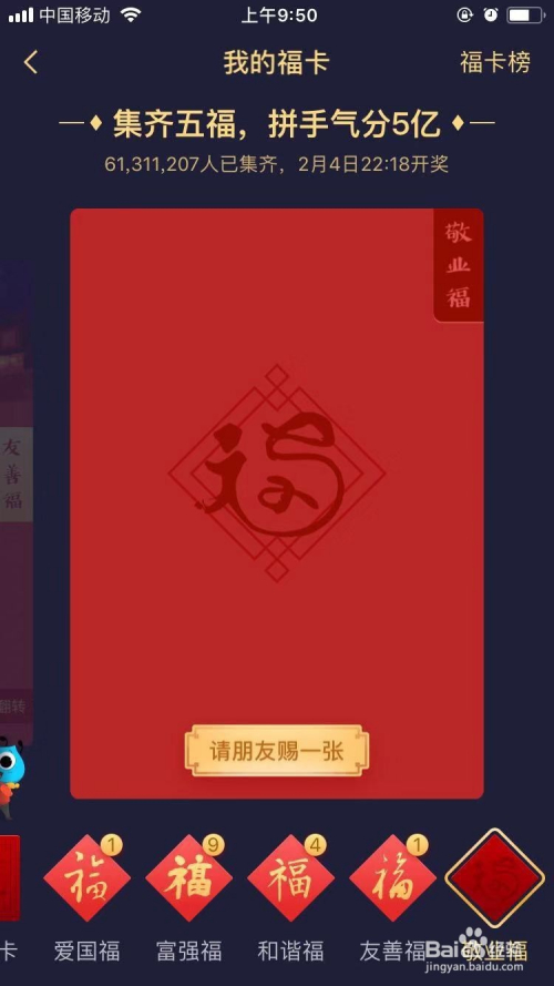 经由过程付出宝老友交换、赠予等获取福卡:点开我的福卡页面,看本身贫乏哪张福卡点击下方的”请伴侣赐一张“,也有机遇获得福卡。