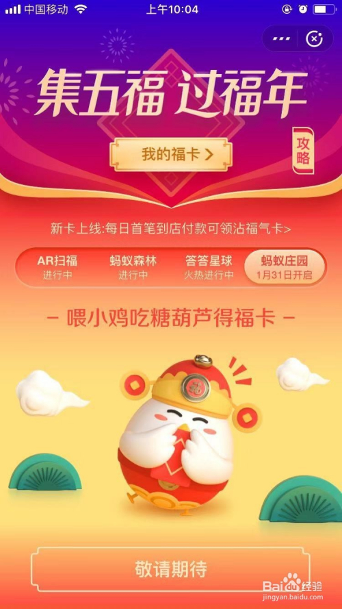 经由过程“蚂蚁庄园”喂食小鸡糖葫芦获得福卡:该项目于2019年1月31日开启,点开付出宝进入蚂蚁状元,点击小鸡头顶的糖葫芦然后喂食给小鸡便有机遇获得福卡,经由过程该体例天天可获取一张福卡。
