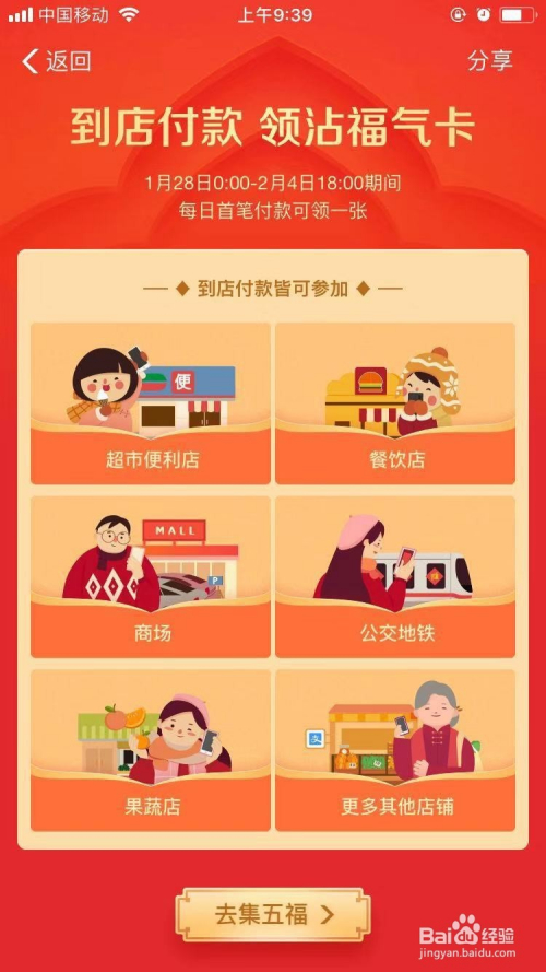 经由过程付出宝线下付条目领取沾福分卡获得福卡:该项目于2019年1月28日开启,天天经由过程付出宝到便当店、超市、商铺、餐饮店等首笔付条目就可以获得沾福分卡,经由过程沾福分卡可以从此外老友那获取福卡哦;