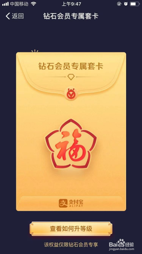 经由过程进级钻石会员领取,付出宝会员在必然期间内利用蚂蚁金服营业累计获取付出宝的积分达到18000就可以进级为钻石会员,钻石会员可直接领取敬业福、花花卡、沾福分卡;