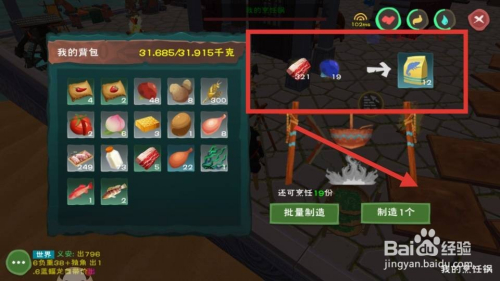 第四步,把材料饲喂肉块和蓝蘑菇放到烹调过中,点击制造1个,如下图