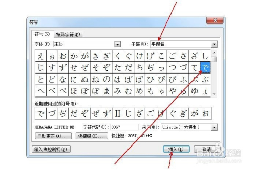 在“子集”中选择“平化名”,并鄙人方选中平化名で,点击“插入”。