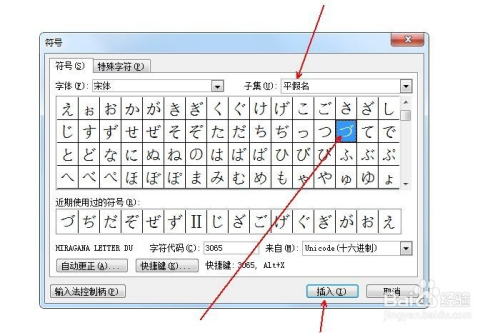 在“子集”中选择“平化名”,并鄙人方选中平化名づ,点击“插入”。