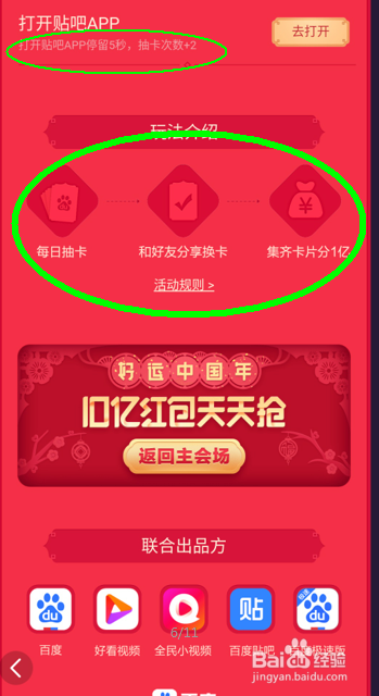 集卡片的活动弄法流程是:每日抽卡>和洽友分享换卡>集齐卡片分1亿元现金红包
