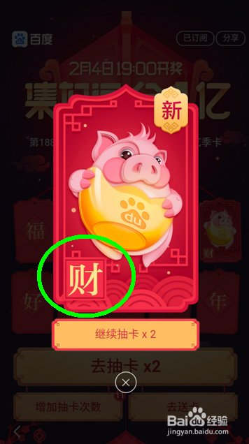 这里点击“去抽卡”介入抽取卡片之后就会弹出抽取到的卡片编号,这里演示抽取到的卡片为:财