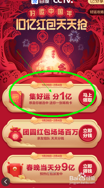进入红包活动界面可以看到在2019年的百度春晚现金红包高达10亿元,此中第一个环节为:“集好运分1亿”的集卡片活动,点击进去即可介入