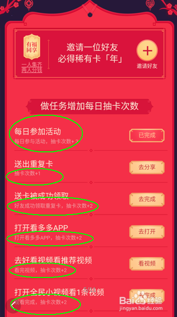 分歧的使命获得的卡片抽取机遇分歧。这里有一个比力主要的体例就是“邀请一位老友 必得罕见卡【年】”可以经由过程邀请老友的体例来获得此卡