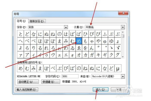 在“子集”中选择“平化名”,并鄙人方选中平化名め,点击“插入”。