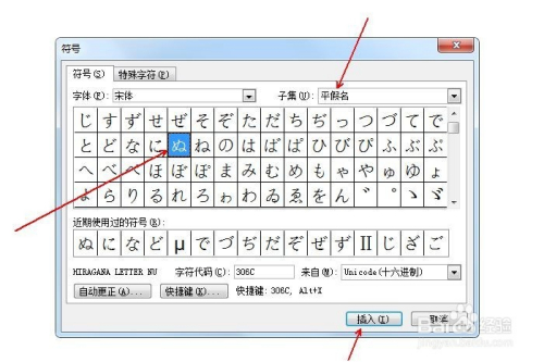 在“子集”中选择“平化名”,并鄙人方选中平化名ぬ,点击“插入”。