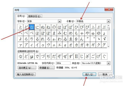 在“子集”中选择“平化名”,并鄙人方选中平化名な,点击“插入”。