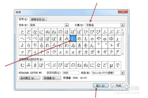 在“子集”中选择“平化名”,并鄙人方选中平化名む,点击“插入”。
