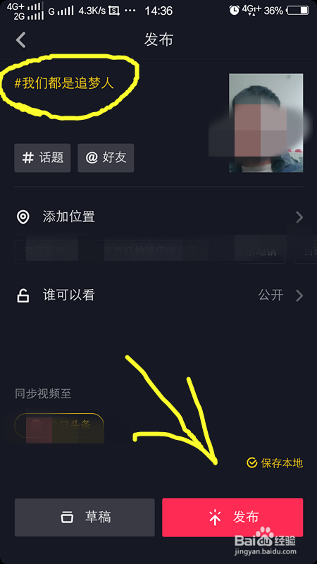 拍摄完毕今后,添加好音乐,我们点击下一步,即可看到左上角我们都是追梦人这个话题了,点击下方的发布,即可发布当作功。