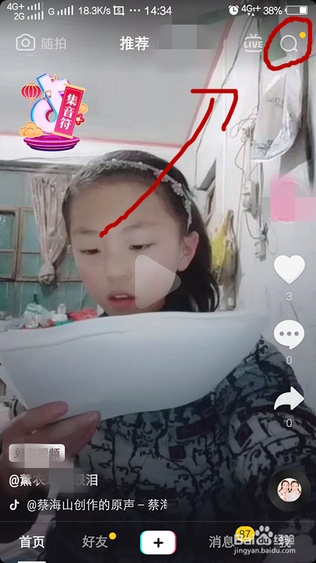 我们进入抖音短视频今后,我们会看到右上角有一个搜刮的标记,我们点击这个搜刮键,进入搜刮界面。