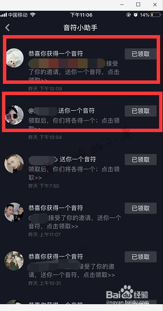 这里有“恭喜你获得一个音符”,是本身发出邀请,老友接管获得音符,也有老友“送你一个音符”,这是老友邀请,本身接管了,等于老友送本身一个音符。