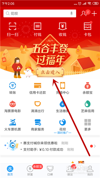 沾沾卡想要沾到花花卡和敬业福仍是要靠命运的,但也必需沾拥有这些卡的老友,不然只能沾到一些通俗的福卡,先在付出宝里点击打开五福活动。