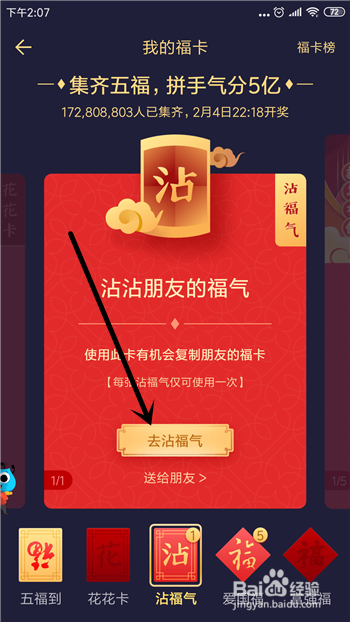 沾沾卡中有一个【去沾福分】,点击起头尝尝命运。