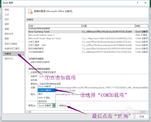 依次点击”加载项“,办理选项中,选择”COM加载项“并点击转到