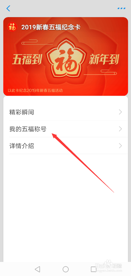 直接点击进入2019新春五福纪念卡界面后,直接点击【我的五福称号】,如下图所示。
