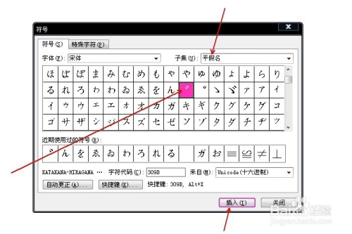 在“子集”中选择“平化名”,并鄙人方选中平化名゛,点击“插入”。