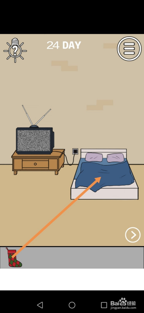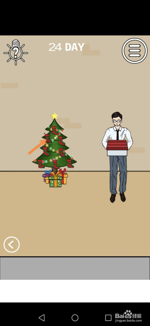 在右边房间里,点击圣诞树上的袜子,然后点击标的目的左箭头进入左边的房间。