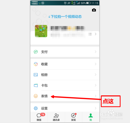 如图,在微信界面上点击“我”跳转页面后点击“脸色”。