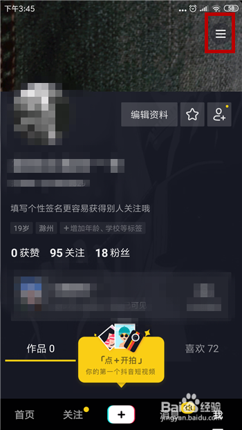 点击之后会打开小我本家儿页,然后点击右上角的【三】选项。