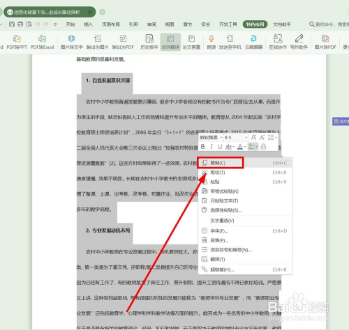 打开WPS文档,选中要转换的文字部门,鼠标右键选择“复制”