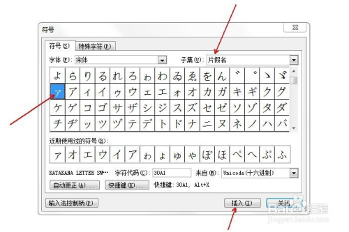 在“子集”中选择“片化名”,并鄙人方选中片化名ァ,点击“插入”。