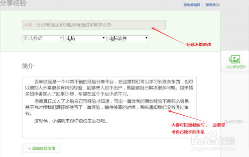 若是没有经由过程审核的原因是经验贫乏关头步调方式的配图,我们仍是从头编纂经验,在关头步调里添加配图,配图必然如果本身的原创哦。配图的方式如下图所示: