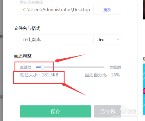 看到如图这个位置,在这里可以直接拖动滚动条来调整画质的质量,质量越低最后的图片质量就会越小,设置当作本身需要的大小即可