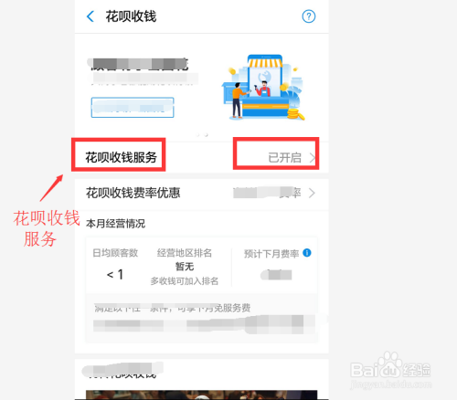 在花呗收钱页面中,找到花呗收钱办事,而且可以看见当前是已开启状况,点击进入。