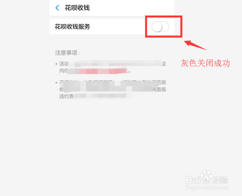 确认弹出的对话框,最后花呗收钱划动按钮底色变为灰色,暗示封闭花呗收钱当作功。